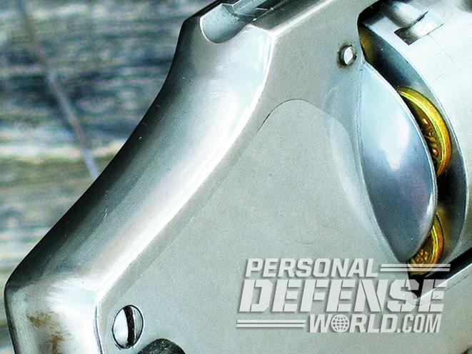 Among several fine choices for better hand-filling grips today, it’s easy to find one that creates more of a surface interface between the gun and your palm. The Pachmayr Compacs on the Model 60 have been around a long time, and they’re relatively thick with a non-slip surface that allows a full three-fingered hold without getting too bulky to offset the concealment factor you’d buy a J-Frame for in the first place, and they’re quite comfortable even with +P .38s in the small-framed Chief’s Special. Priced at $38 on pachmayr.com, they’re a good buy. Note, however, that one empty case will hang up against the forward edge of the left grip panel on ejection unless you trim the rubber a little there.