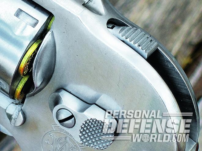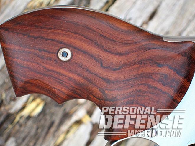 In 1986, S&W was still using the flash chrome on the hammer and trigger. My Model 649’s trigger is a non-serrated, smooth-faced, 0.312-inch-wide “combat” unit, and the hammer uses the older firing pin style, along with the older two-pin extractor. It originally came with small walnut grips, but I’ve never found those to be very effective in J-Frame sizes, so I replaced them with rosewood Eagle Secret Service grip panels.