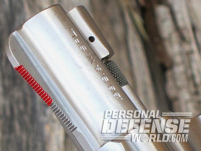 Sights are the other limiting factor, and on stainless revolvers they’re just flat hard to find in a hurry and line up for accuracy. They’re small, and they’re bright in certain lighting. That doesn’t mean they’re useless—they just need a little help. In the past, to reduce glare and produce contrasts, I’ve blackened the front blade and rear notch face on fixed-sight stainless revolvers with model airplane paint, which works perfectly well. The Model 60 already had a reddish paint applied to its blade, and that color contrast may be faster in use than black on black for some eyes. Adding contrasts and eliminating the silvery glare-on-glare is always an improvement on these little blasters, and makes better shooters out of them and you.