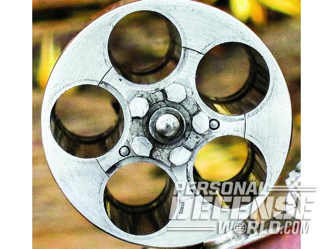 It also features the pinless extractor star that was incorporated into the Model 640 along with those rubber boot grips in 1994. For decades, in each of its DA revolvers, S&W used two tiny locator pins embedded in the rear of the cylinder that aligned with corresponding holes in two star “arms” to correctly position the star when it returned to its normal resting place after ejection. Those pins were vulnerable to bending under overly enthusiastic ejector manipulation and could occasionally fall out after many years of hard use. The new design was stronger, less likely to fail, cheaper to manufacture, worked every bit as well, and you can see how the star arms were machined to fit in their recess in the included photos.