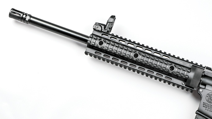 The 16-inch barrel is made of 4140 steel. The threaded muzzle is capped with an A2-style birdcage flash suppressor. The barrel has 5R rifling, and Smith & Wesson elected to use a 1-in-8-inch twist rate instead of the more common 1-in-9-inch twist. The faster twist rate helps to stabilize heavier bullets.