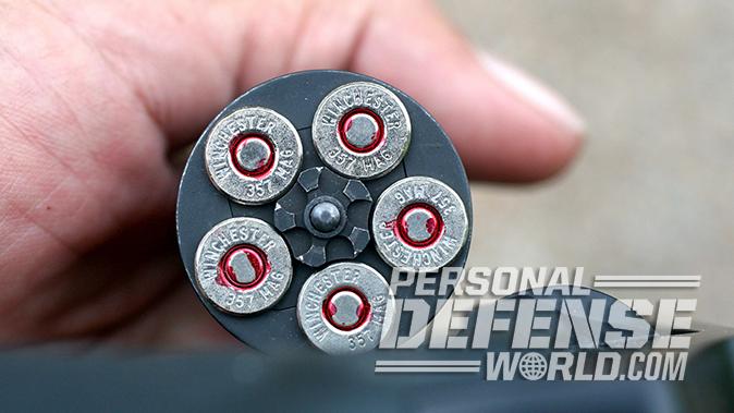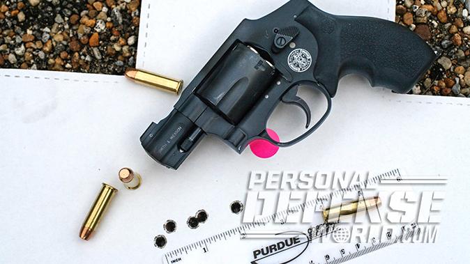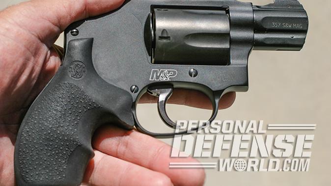 Durability: The M&P340 brings to the table a well-crafted mix of metallurgy. scandium alloy makes it as light or a bit lighter than a similarly sized aluminum-framed .38 Special Airweight, but it’s rugged enough to handle .357 Magnum ammo and a steady diet of .38 Special +P rounds, while the five-shot cylinder is made of PVD-finished stainless steel. The two-piece barrel is also shrouded to protect the ejector rod. Careful inspection reveals a steel shield embedded in the topstrap of the frame, just above the barrel/cylinder gap. This protects the frame from the flame-cutting effect of high-pressure Magnum ammunition.