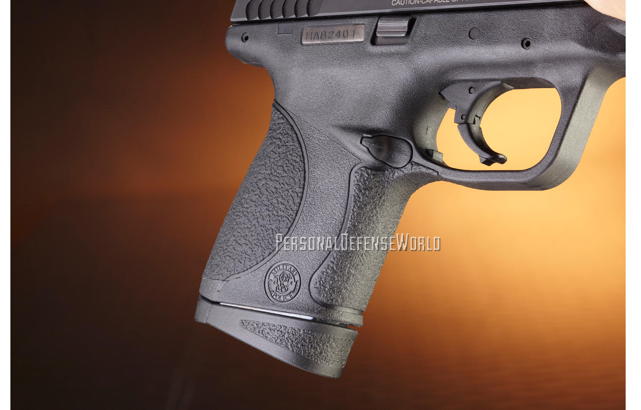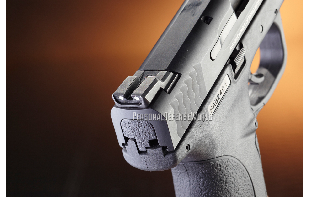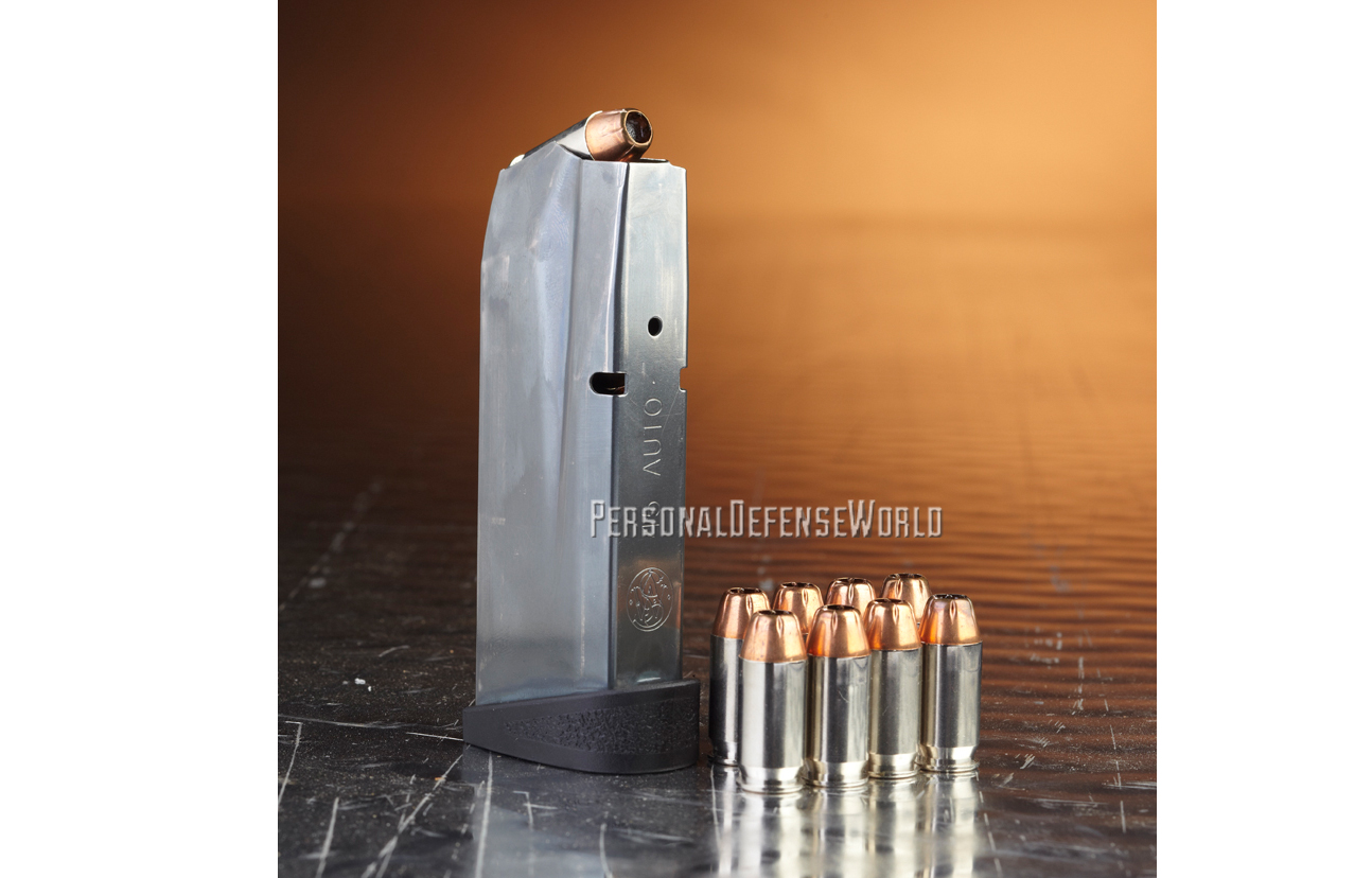 Like the other M&Ps, the M&P45c ships with a pair of magazines. They are rated for eight rounds, but it’s a tight fit when you try an in-battery reload. One magazine has the flat floorplate for concealment and the other has an extended floorplate, which provides a place for the small finger to rest.