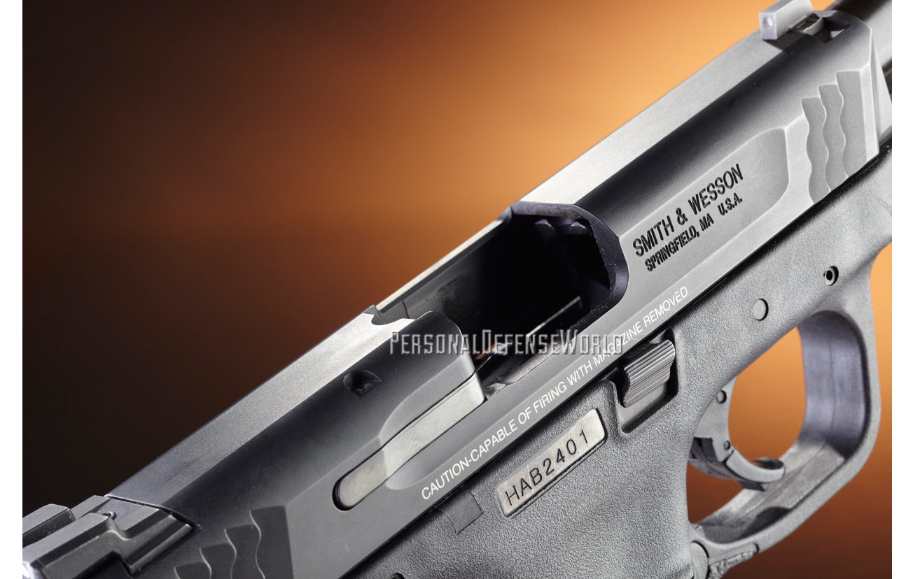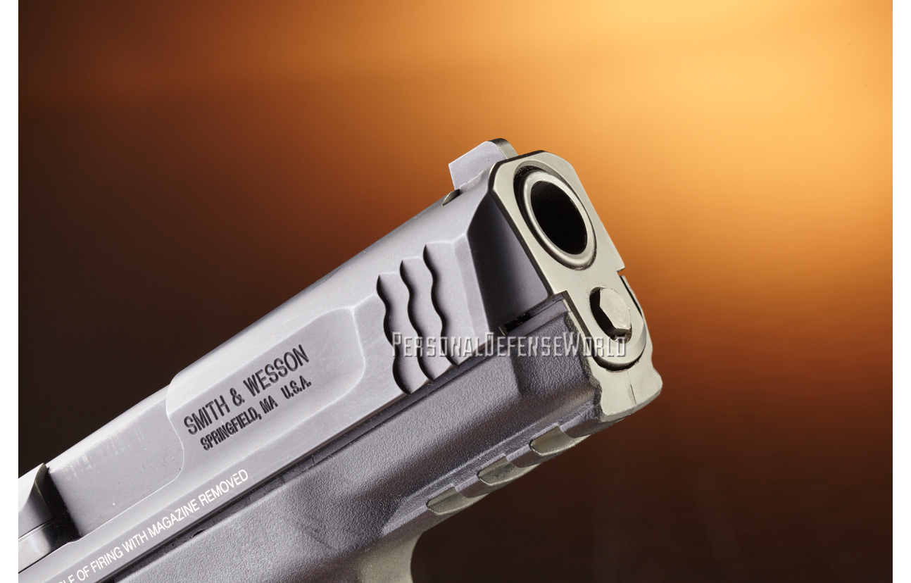 The M&P autopistols have been around since late 2005. The slide and barrel are through-hardened stainless steel finished with a corrosion-resistant finish for a hardness rating of 68 HRC. Unlike earlier iterations of the M&P semi-autos, the current guns are no longer marked “stainless” on the left side of the slide. The M&P45c also has a new low-profile rear sight with a cocking ledge and no manual thumb safety. The pistol also lacks the longer “frame tool assembly”—the part that holds the interchangeable backstrap in place and can be used to push down the sear-deactivation lever. It lacks a lanyard loop, but since it’s designed for concealment, the M&P45c doesn’t need the added protection a lanyard loop offers.