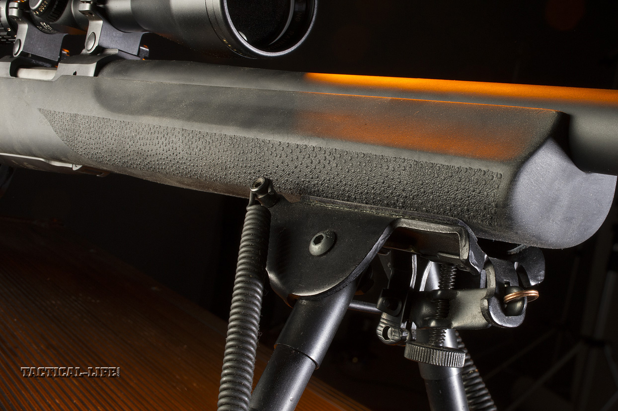 Built on Ruger’s proven Model 77 Mark II action, the rifle has a fixed ejector and a full-length claw extractor. It features a matte black/blued finish on all the metal surfaces of the rifle, with the exception of the bolt, which has a matte grey finish. The rifle has a heavy-contour barrel that measures 0.80 inches at the muzzle, and it is also threaded. Out of the box, the barrel is fitted with a flash suppressor, but it can be removed, which provides the option of attaching a sound suppressor. “The Hawkeye also has a synthetic OverMolded stock from Hogue. And that’s not a bad thing. One of the most accurate rifles I own has this same stock on it, and I’ve tested several others so equipped,” stated Mann during his review. Also, the rifle comes with a short Harris bipod, which, as the author points out, is worth at least a hundred bucks alone.
