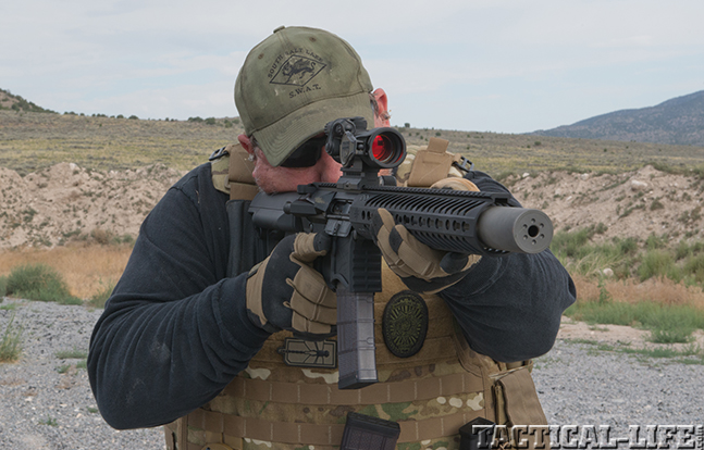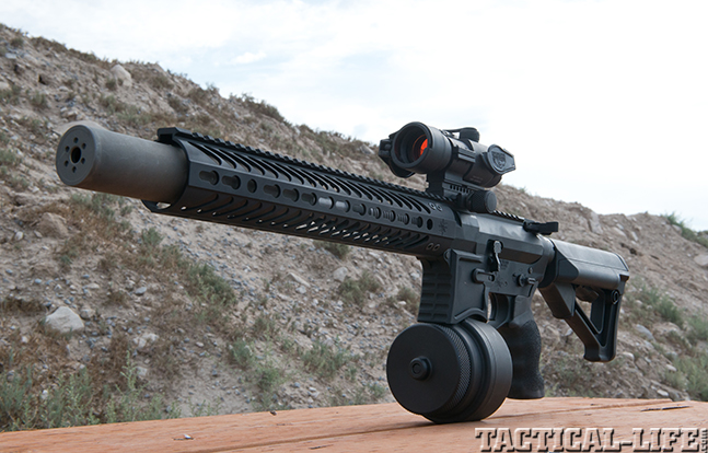 The SPROV3 has several custom-grade features. The upper features a Melonite-coated, 8-inch, radial-fluted barrel; a 12-inch, free-floating handguard; M4 feed ramps; an adjustable gas block; and a BCM Gunfighter Mod 3 charging handle. The lower features an Ergo Deluxe grip, an ACT trigger and a Magpul STR stock.