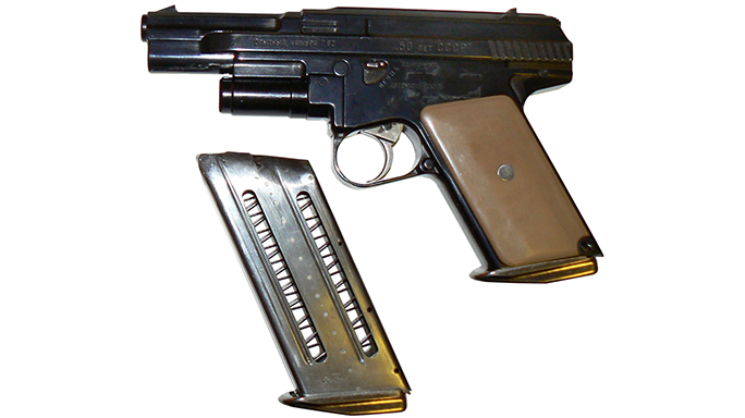 It should be noted that in the post-war era, handguns were rather low on the army’s list of priorities, but we will mention another one before turning to larger guns. The Gerasimenko VAG-72 pistol was designed in 1972. But the VAG-73 that came out a year later is even more interesting. It featured a large 48-round magazine, made as a tandem box with two compartments. It also fired proprietary “caseless” 7.62mm ammunition that consisted of a projectile with a hollow base that contained the propellant and primer. This ammunition concept was similar to the 19th century Volcanic pistol, and it similarly failed to attract any military buyers.