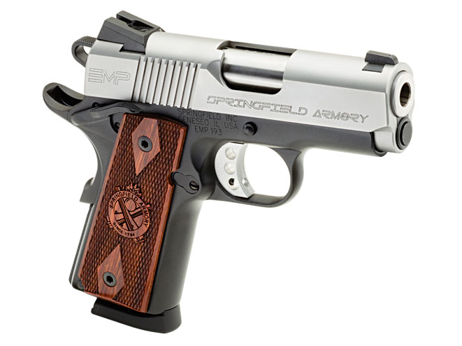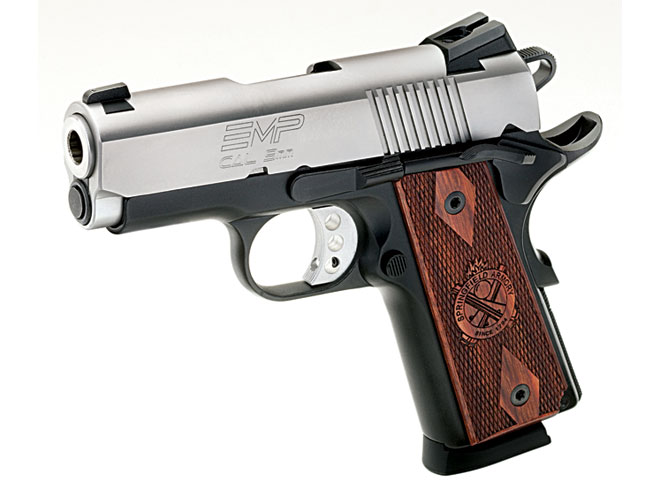 How could the venerable 1911 design be improved? Colt has made numerous upgrades over the last 100 plus years, including smaller models like the Commander and Officer’s versions, but Springfield Armory took 1911 dimensions to a new level with the introduction of the Enhanced Micro Pistol (EMP). The action of the EMP is 0.125 inches shorter than that of the original 1911. This translates into several concrete advantages for the shooter.