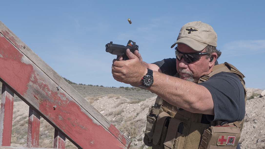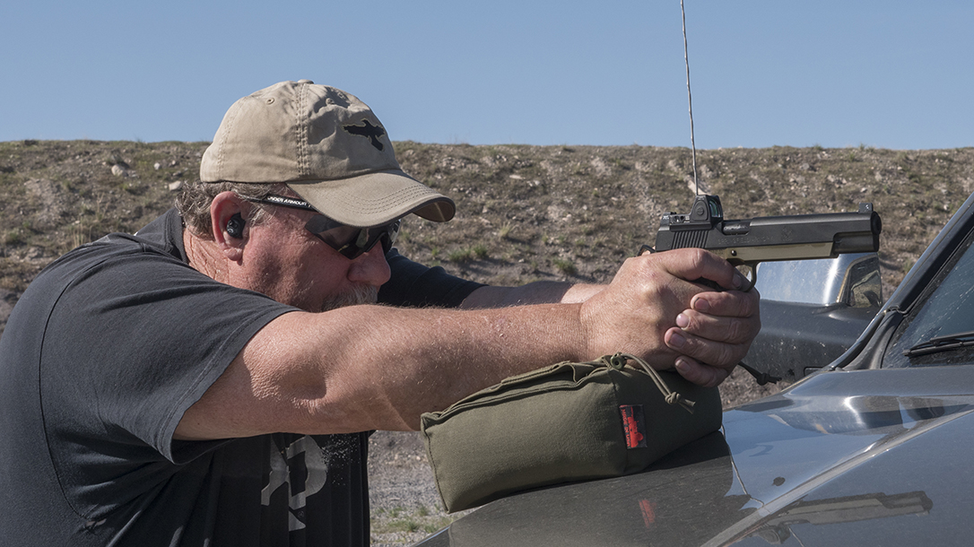 This kind of long-range accuracy is why I have carried a 10mm for years. Not that you can’t do this with a 9mm or .45 ACP, but it’s a lot easier with flat-shooting 180- to 200-grain 10mm rounds moving at 1,300 fps.