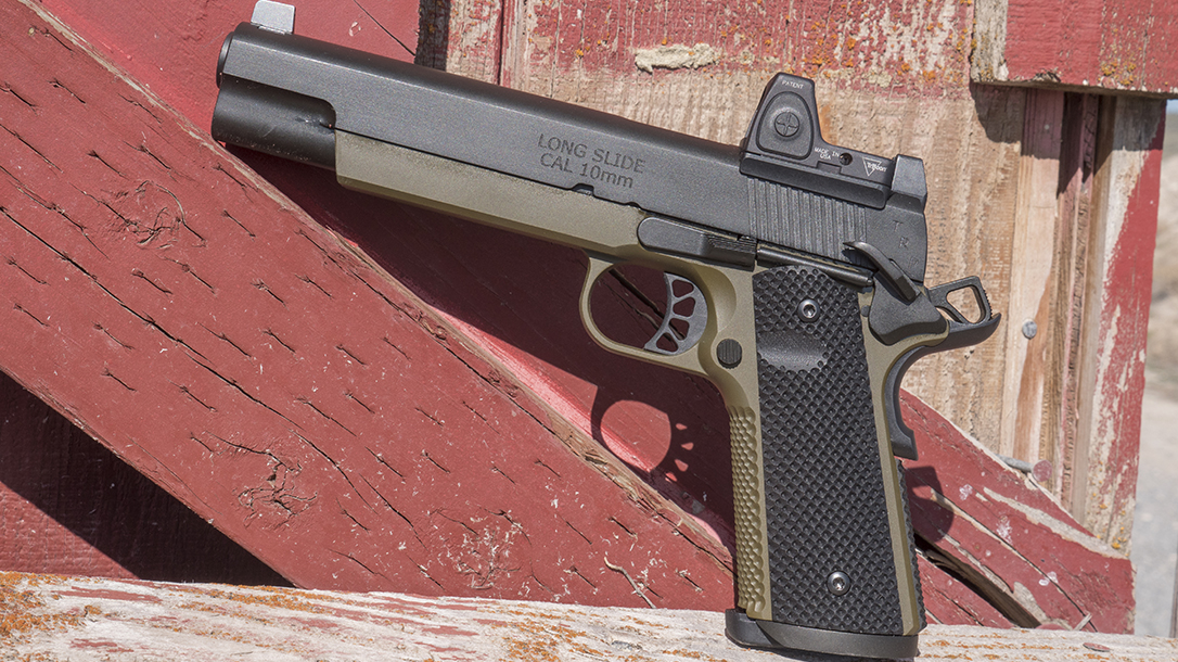 The frames are also forged from steel, though the 6-inch-barreled TRP 10mm has an olive drab finish while the 5-inch-barreled version has a Black-T finish. The frontstraps and mainspring housings utilize Posi-Lock texturing for enhanced traction, and beveled magazine well funnels are installed for faster reloads. The grip panels—green and black on the 5-inch-barreled model and just black on the 6-inch-barreled version—are made of durable G10.