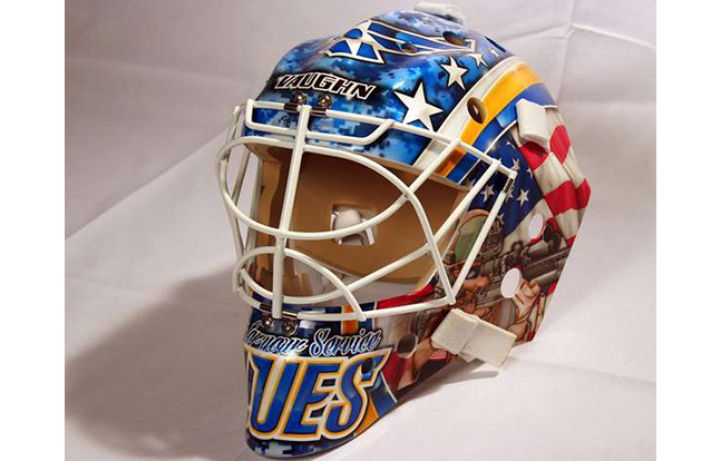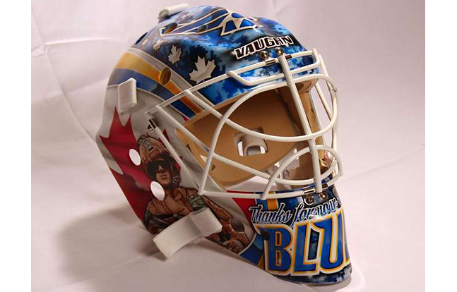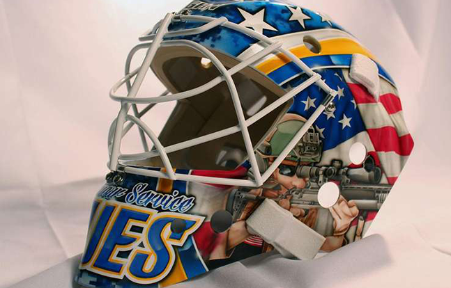 Replacing his usual headwear, Elliot wore a special military mask for the Veterans Day game (see the photo gallery below). The mask was delivered to the goalie by World War II veteran Charles Rohde after Monday’s practice, according to a release.