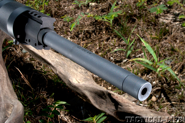 The 6.8 SPC was designed for use with 16-inch barrels. ARs purpose-built for hunting, like the Stag Arms Model 7, have 20-inch barrels and can squeeze a bit more speed and energy out of cartridges than shorter 16-inch barrels. The SSA 110-grain Nosler AccuBond Tactical loads are factory clocked at 2,630 fps, but the Stag Arms Model 7 ekes out another 71. Hornady factory 110-grain V-Max clock at 2,550 and the Stag Arms rifles squeeze out 30. Granted an extra 30 to 70 fps isn’t an overwhelming amount of power, but it does give the longer barreled ARs a slight edge over short-barrel ones. The Stag Arms Model 7 barrel is free-floated with a medium contour that tapers down to 0.7 inches and an 11-degree crown at the muzzle. The bore is Spec II with four grooves and a 1-in-11-inch twist rate.