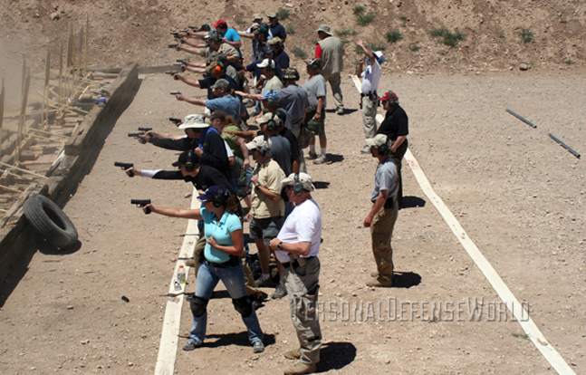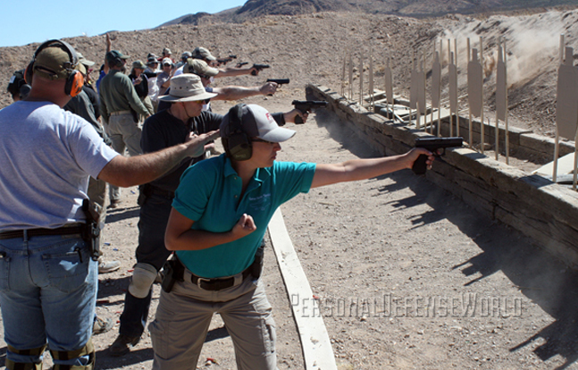Next, the new student should be learning speed reloads and sustained rapid fire. Basic shooting will have begun at close range, perhaps at as little as 3 or 4 yards. Then move to seven paces. Then 10, 15 and 25. Longer-range shooting is a more advanced skill, certainly one worth learning, but far from the best place to start. Learn to safely and swiftly draw, and safely and deliberately holster, early on. Working from the holster is best done with a triple-checked, unloaded gun, or a dummy gun, before doing so with live ammunition.