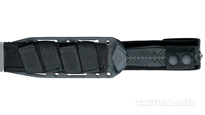 The knife extracts out of the durable Kydex sheath in a smooth manner and securely attaches to packs, belts and other key positions.