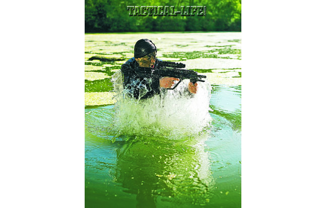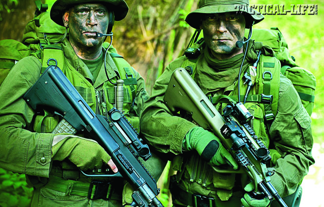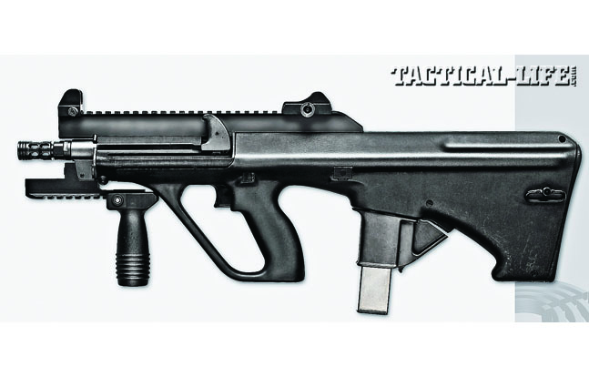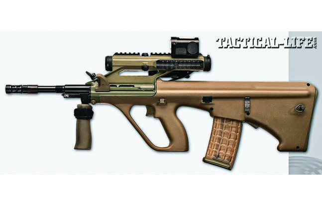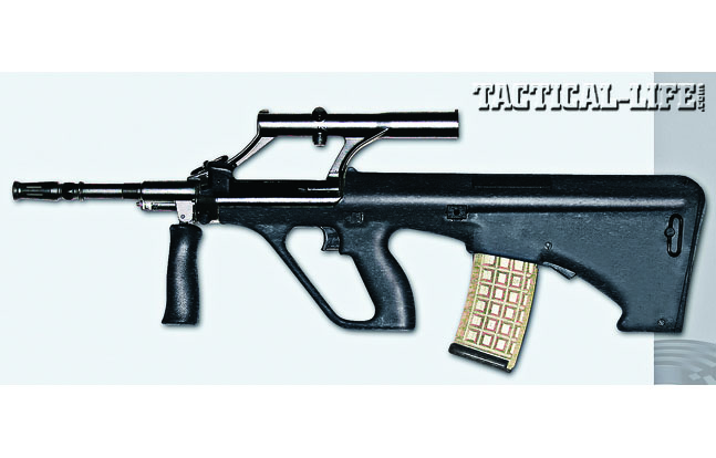 The Steyr tactical rifle line may include some of the most varied and tested bolt-action military rifles out there, but the black gun that brings a thrill to most shooters is the Steyr AUG. While Steyr’s SSG was one of the first military bolt-action rifles to use space-age material, its 5.56mm NATO “Army Universal Gun” was the one of the first truly “space-age”-looking weapons. A radical bullpup (the magazine is located behind the fire control mechanism), the AUG has a telescopic sight built into the receiver, a flip-down forward grip, a skinny barrel that can be removed without tools, and clear plastic magazines—no one in my shooting circles had ever seen a battle rifle like it.