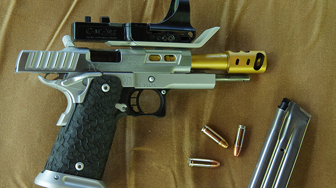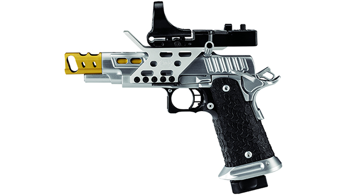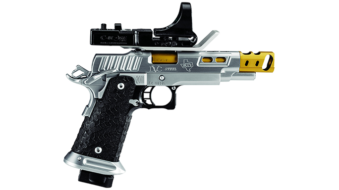 The DVC Steel features a 4.15-inch barrel, plus a TX1 compensator. The barrel is TiN coated for a longer lasting fit and enhanced lubricity. The pistol also boasts a DVC stippled grip; oversized maxwell; extended magazines; and the Recoil Master dual spring system, as well as 2.5-pound trigger pull; front and rear slide lightning cuts; C-More 6-MOA sights.