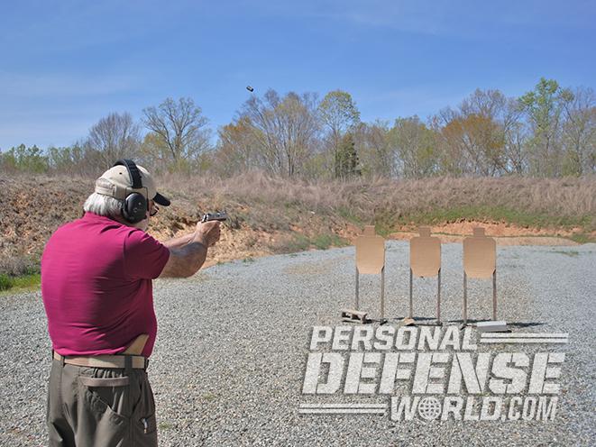 I began with my back to three IPSC targets and hands raised above my shoulders. Upon a signal, I turned, drew the pistol and double-tapped (fired two shots) on each target. I then performed a combat reload and reengaged the trio of targets with one headshot each. I repeated this drill six times, and each “head” had a half dozen 9mm holes in it.