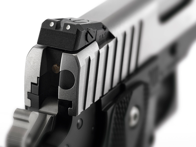 The STI Guardian 2011’s side is made from stainless steel with an attractive semi-matte finish. Dovetail cuts at either end are filled with a square blade with a white-dot front sight while the rear sight is a fully adjustable TAS sight, again adorned with white dots. The ejection port is lowered and flared for reliable ejection of spent cases, and the square-cut grasping grooves at the rear of the slide provide a non-slip purchase for reloading or clearing any possible malfunctions.