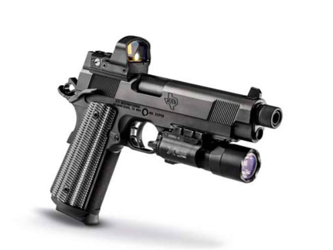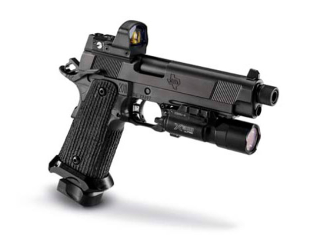 Available in both 1911 and 2011 models, the H.O.S.T. pistol comes with either a 5-inch or 4.15-inch barrel. Both barrel variants have a small classic cut to allow the shooter to install a suppressor without needing an extended adaptor. The advantage of this is that the gun has a long dust cover with a shorter overall length. Chambered for 9mm, .45 or 10mm (5.0 only) and featuring a black DLC coating to withstand harsh use, the STI H.O.S.T. pistol will accommodate your optics and suppressors with ease.