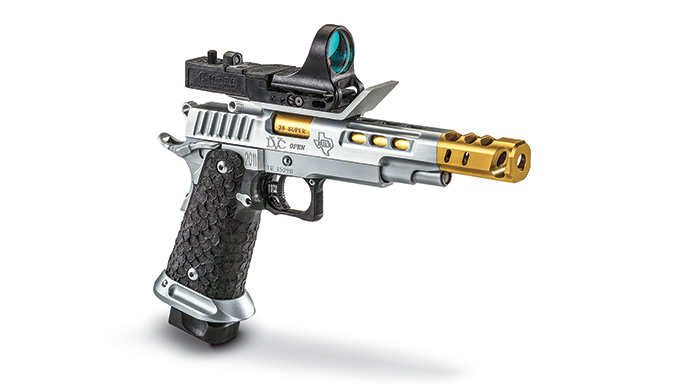 STI could credibly argue that the DVC Open is the ultimate in race guns. Similar to the DVC Limited pistol, the DVC Open uses a hard-chromed slide and frame with a 5-inch, titanium-nitrided barrel. With the “Open” class designation, the gun is also fitted with a compensator to reduce muzzle rise. A 6-MOA C-More sight is mounted on the pistol along with a reversible slide racker. The trigger pull is set at 2.5 pounds, and STI offers this gun in both .38 Super and 9mm.