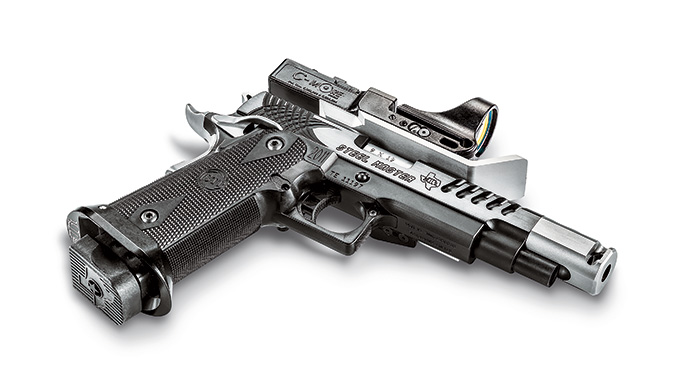 Designed for the fast-paced Steel Challenge matches, the Steel Master is all about speed. STI designed the gun with a short slide and a 1.6-inch T1 compensator for fast target transitions and reliability with light loads. The tuned trigger pull drops the hammer at 3.5 pounds. This 9mm handgun is equipped with a factory-mounted, 6-MOA C-More sight to enhance the speed of target acquisitions. An integral blast shield ensures that the sight is not occluded when running the gun hard.