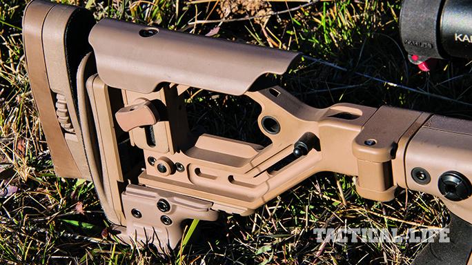 This project actually started with the stock—Accuracy International’s AX chassis system. I’ve used several complete Accuracy International rifles and chassis systems over the years, and the AX represents the pinnacle of the company’s designs. Shooters can adjust the length of pull, cheek height, buttpad and pistol grip, making it a perfect choice for prone shooting—the most common setup for police countersnipers. The buttstock also folds to the right side, making it easier to transport rifles with longer barrels and sound suppressors. Up front, the forward handguard offers Picatinny rails and KeyMod slots for accessories. All told, this chassis has excellent ergonomics without being too heavy.