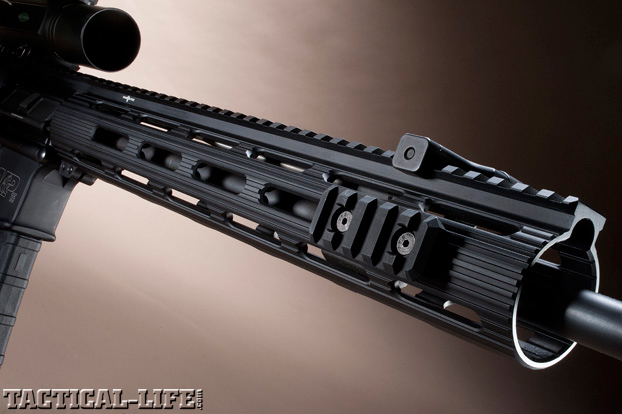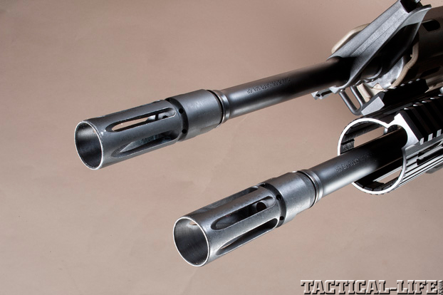 Both guns sport 16-inch barrels with 1-in-8-inch twist rates and 5R rifling and are treated with Melonite hardcoat exterior finishes. They also share the same chrome-plated gas keys and bolt carriers, S&W’s Enhanced flash suppressor systems and black anodized receivers. The 5R rifling, incidentally, is the same used in Thompson-Center’s Icon, Venture and Dimension bolt-action rifles. The 5R consists of five rather than six lands and grooves, with each land’s width being greater at its base. (I guess you could describe them as flattop pyramids in cross section.) By reducing the normally 90-degree angle at the base of each land to 60 degrees, you eliminate the sharp inside corners that tend to clog with copper fouling. The result is a barrel that’s less prone to fouling and easier to clean and has a slight increase in velocity via the reduced bore friction.