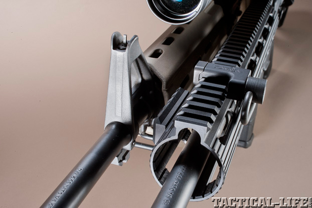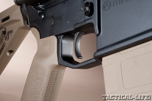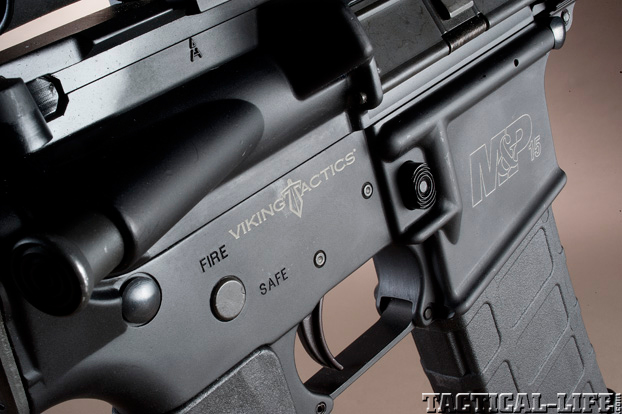 But where these guns differ from one another—considerably, I might add—is in their details. The VTAC is the result of a collaborative effort with Viking Tactics, and for the MOE Mid, S&W teamed up with Magpul Industries. What distinguishes the VTAC is its Troy 13-inch Extreme TRX handguard, IMod six-position collapsible stock and Geissele Super V 4.5-pound, quick-reset trigger. The Magpul sports a co-branded forged lower receiver with a flared magazine-well opening for faster, surer insertion, and there’s a larger triggerguard bow to accommodate gloved fingers. Magpul also provides the buttstock, the handguard with vertical grip, and the folding MBUS rear sight in conjunction with an M4 A2 post front sight.