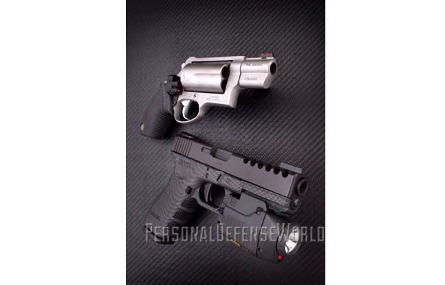 Another option is Crimson Trace Lasergrips for revolvers, which are available for J- and N-Frame models, such as the S&W Model 325 PD chambered in .45 ACP. There are also S&W models that come equipped from the factory with Lasergrips. Lasergrips are a good option as they are the easiest of any to use. There is no switch to activate, although there is an on/off switch to conserve battery life. The act of grasping the revolver in the strong hand automatically activates the laser. A revolver with laser grips is an ideal combination for a basic home-defense handgun—it is the essence of simplicity.