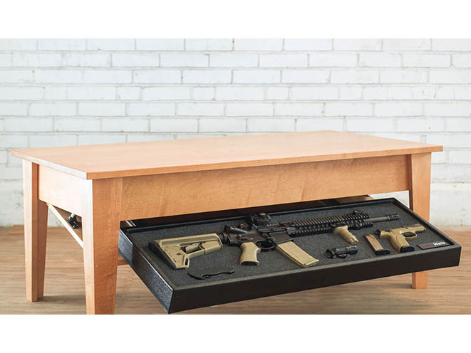 As the press release notes, the Coffee Table and End Tables appear at first glance to be high-quality pieces of wood furniture. They’re actually much more than that. If you swipe one of the two preprogrammed RFID cards that come with the unit, a hidden compartment underneath the table is unlocked, giving you access to your firearm.