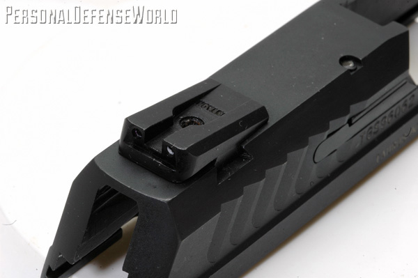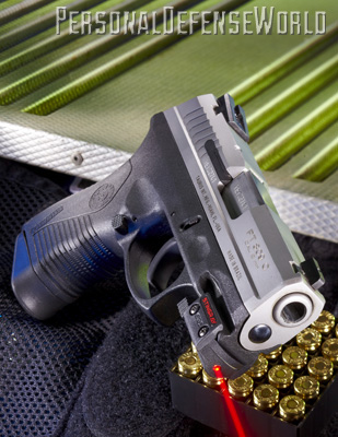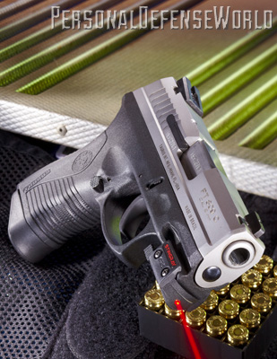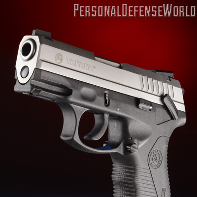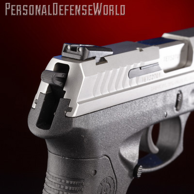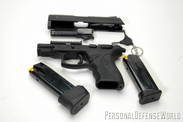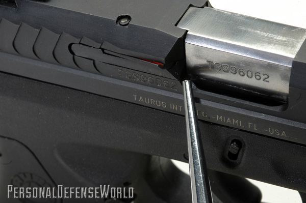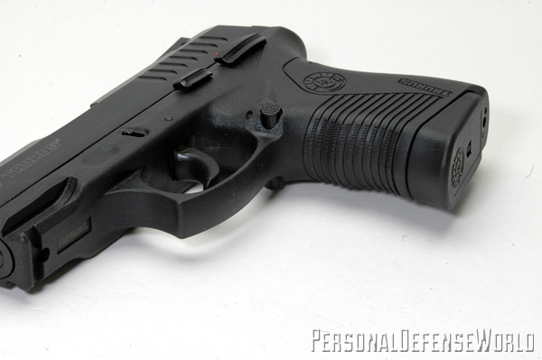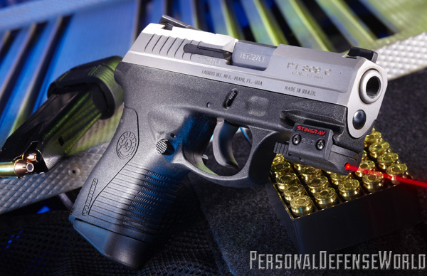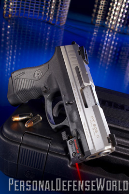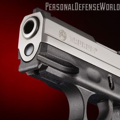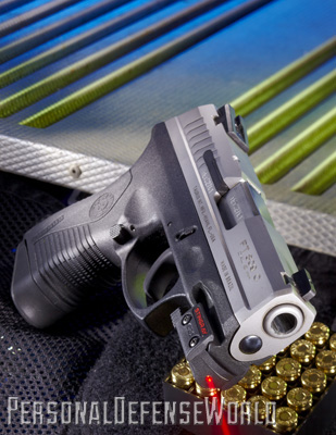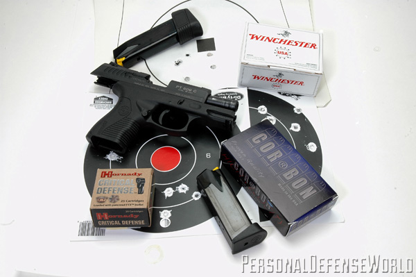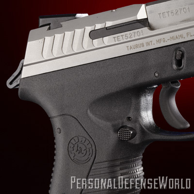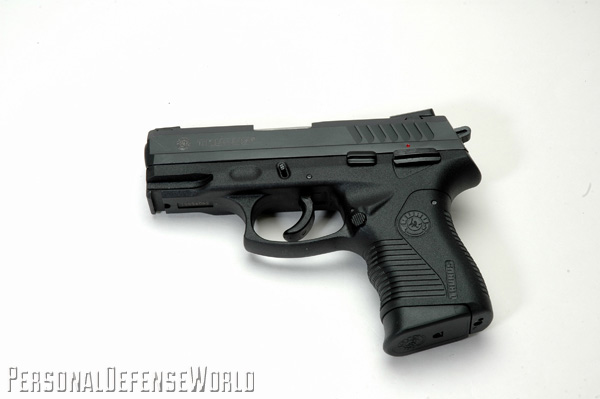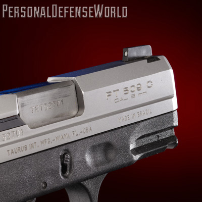 The Taurus PT 809 C is a combination of steel, polymer and aluminum. The steel slide assembly rides on an aluminum insert, which is contained in a polymer shell. The PT 809 C is offered in 9mm and ships with two magazines, a 13-round, flush-fit mag and an extended, 17-round mag. The baseplates are removable, as is the friction-fit, polymer collar spacer on the 17-round magazine, which has molded, horizontal checkering duplicating the checkering used on the frontstrap, the backstrap and parts of the grip’s sides. The steel slide’s body is stepped, with a small lower portion of it larger than the vertical body above. This portion then meets another flat segment that in turn meets the flat area between the three-dot sights. The front sight is slightly angled and dovetailed into the slide, as is the Novak rear sight, which is additionally secured with an Allen screw. Both sights are windage-adjustable…