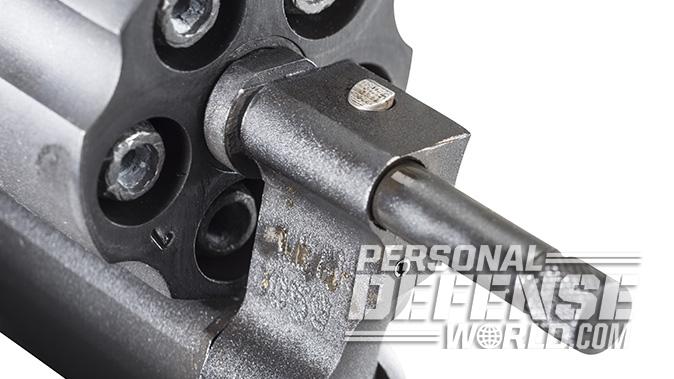 The stainless steel cylinder is locked into the frame by a spring-loaded center pin passing through and projecting out past the rear of the ejector rod, where it enters a recess in the recoil plate holding the cylinder in place, all while a spring-loaded stud on top of the cylinder crane engages a mortise in the frame. This provides additional locking strength. Pushing the thumb latch on the left side of the frame forward forces the center pin out of its locking recess in the recoil plate. This allows the cylinder to be swung out to the left. Pushing in the ejector rod then forces out a star-shaped extractor that extracts all the cartridge cases simultaneously.
