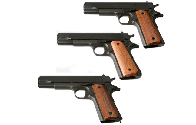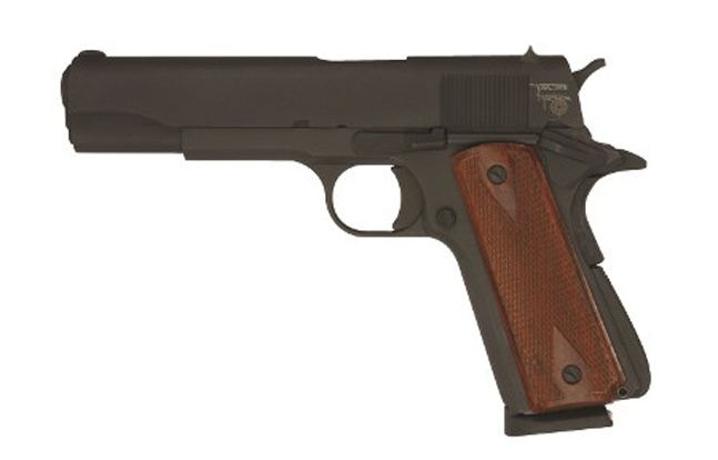 The 1911 model is a close reproduction of the original U.S. Government 1911 semi-automatic pistol and is chambered for .45 ACP ammunition. This is a single column, magazine-fed pistol with an eight-round capacity. Taylor’s offers four models of the 1911 style: the different models feature a unique magazine spring shape, and one has a lanyard ring (details below). All of the 1911 models are series-70 compatible. Taylor’s 1911 comes complete with a black carrying case and a total of two magazines.