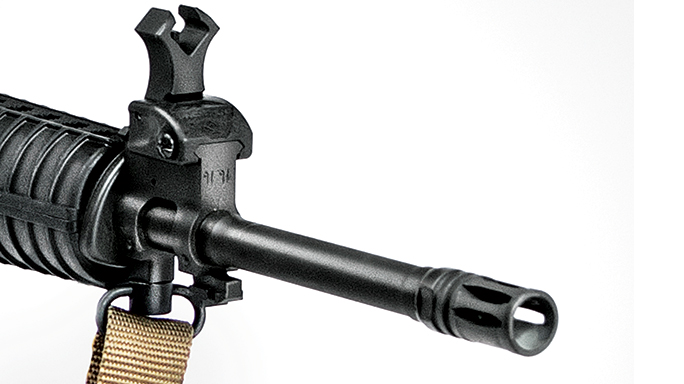 Additional weight reduction came from using a medium-profile barrel rather than a heavier profile. The SRC-308 features a medium-profile, 16.5-inch, 4150 chrome-moly-vanadium steel barrel capable of handling .308 and 7.62mm NATO cartridges. The 1-in-10-inch-twist bore and chamber are chrome lined, while the exterior wears a black manganese-phosphate finish. The threaded muzzle comes with an A2-style flash suppressor. Surrounding the barrel is a set of M4-style, ribbed and tapered handguards with dual heat shields. Windham’s SRC-308 uses a bolt built from Carpenter 158 steel. The chrome-lined bolt carrier has a properly staked gas key and a black manganese-phosphate external finish.