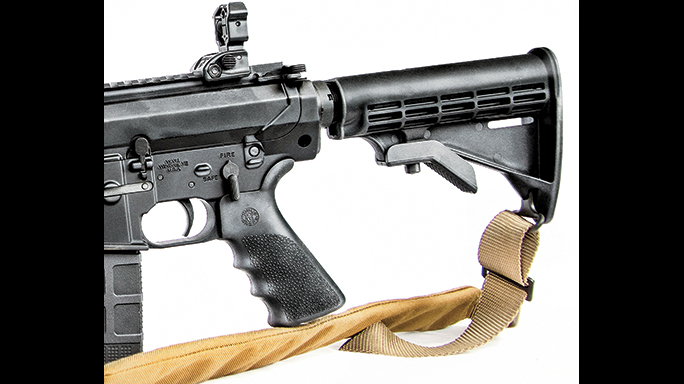 Completing the SRC-308 is an M4-style, six-position-collapsible buttstock with a checkered, hard-plastic buttplate and one of Hogue’s comfortable and effective OverMolded pistol grips made of soft rubber and textured, replacing the less desirable hard-plastic A2 grip.
