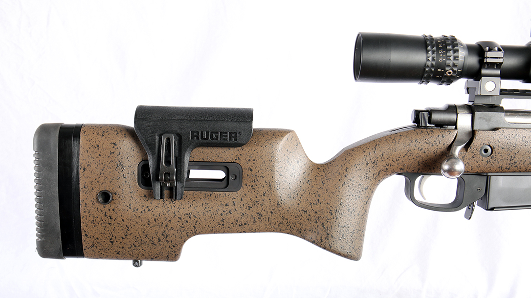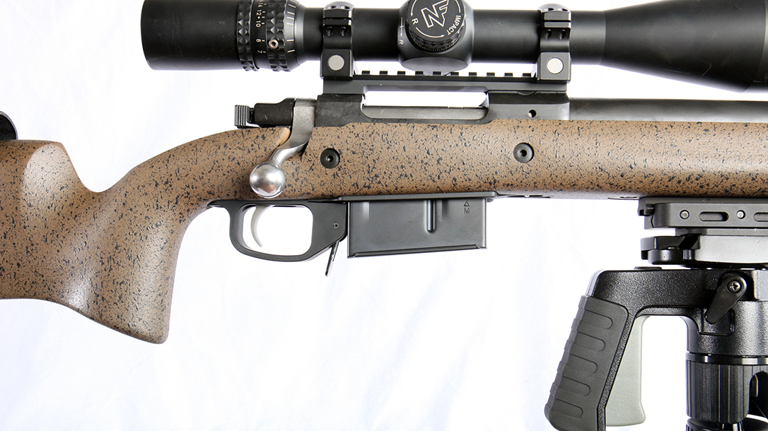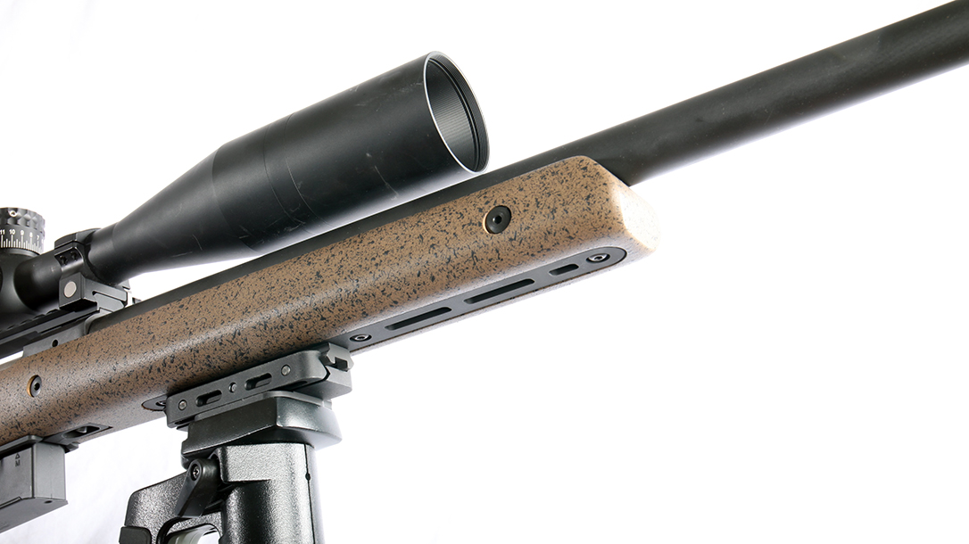 A laminated wood Target stock features a two-way adjustable comb, adjustable pull length with soft rubber buttpad, QD attach points and a flush-mounted Lower M-LOK rail. Also, the stock is painted with a textured two-tone paint. Additionally, this rifle’s two-stage, adjustable target trigger features a short take-up stage, followed by a light 2.75-pound pull with a bit of creep.