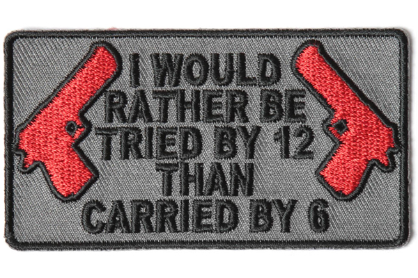 • “Tried by 12” – You’ve undoubtedly heard the phrase, “I’d rather be tried by 12 than carried by six.” It’s a great phrase that embodies the whole second amendment principal. This patch includes the phrase in black against a gray background, flagged by red pistols on either side.