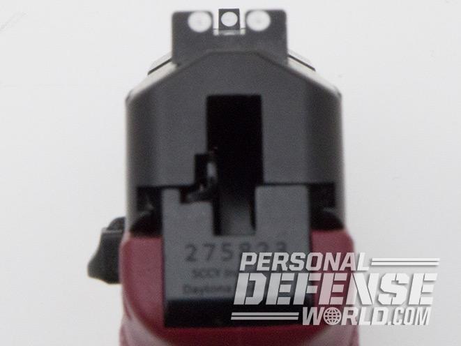 I measured the trigger pull weight on the SCCY to be 8.75 pounds on an average of 10 pulls with my Lyman digital gauge. However, the pull seemed significantly heavier. The SCCY CPX-2 fills my medium-sized hands well, but the trigger reach is much too long for me. Only the tip of my trigger finger was able to properly address the trigger face, which may have contributed to the heavier feel of the trigger.