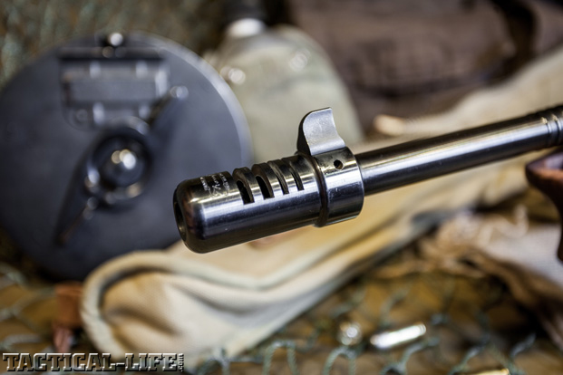 In 1938, the Thompson submachine gun was adopted by the Navy as the M1928, essentially an M1921 with heavier internals and a slower 720-rpm rate of fire. Contemporary Auto-Ordnance catalogs state the weapon was called the 1928 as naval issue and the M1928A1 as Army issue. Reportedly, original 1928 naval guns were simply over-stamped “1928.” Dedicated military production of the 1928A1 dropped the forward pistol grip, added sling swivels and had a lesser but still-very-good military finish. Various productions show finned or plain barrels, some with and some without a Cutts compensator. Of interest is that the M1928 was the last small arm Uncle Sam adopted that bears the year as its model designation. The M1928A1 had provisions for box or drum magazines. It usually had a Cutts compensator and annular cooling fins, employed the Blish delayed-blowback action and mounted its charging handle on the top of the receiver. The original rear sight was finely adjustable and optimistically graduated.