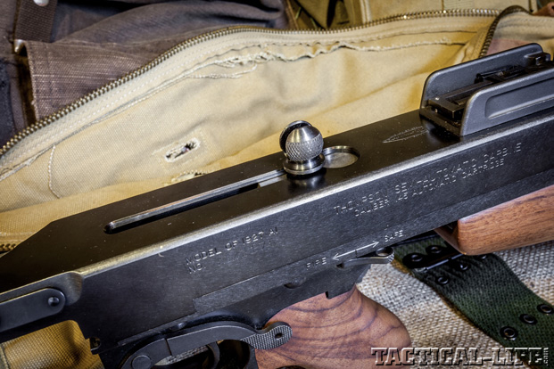 The major complaint of the Thompson was its weight and complexity. Not a lot could be done about the weight without a complete redesign, but the original M1921 gun had been over-engineered to capitalize on the perceived benefit of the Blish lock and as such was unnecessarily complex. The contemporary MP 18 and a dozen other subsequent designs worked with a simple inertial-lock (blowback) action. Why wouldn’t a Thompson? The staff at Savage Arms looked for ways to simplify the M1928A1, producing a blowback prototype in February 1942 that was tested at Aberdeen Proving Ground that March. Army Ordnance approved its adoption as the M1 the following month, in April. M1s were made by Savage Arms and by Auto-Ordnance and issued with the new 30-round box magazine—they would not accept the drum. The charging handle was moved to the right side of the receiver, riding in a slot. The simple rigid L-peep rear sight of the M1 proved weak: in the M1A1 model it was provided with protective ears, and the bolt was further simplified to a one-piece unit with a fixed fixing pin. Parts assemblies could be swapped, and the fire-control switches and mag release were further simplified on the M1A1.