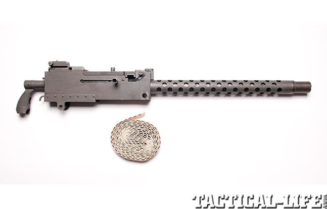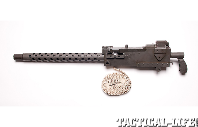 One of the better-known American-made, belt-fed MGs used during WWII was the M1919. The M1919A4 was a recoil-operated, air-cooled, belt-fed, .30-06-chambered light machine gun with an 18-inch barrel that had a rate of fire of 400 to 550 rpm. In order to enable air to cool the M1919 under firing conditions, a ventilated shroud was installed over the barrel. Because the M1919 was air-cooled instead of water-cooled, the M1919 was lighter and easier for a machine gun crew to carry and use in combat. When equipped with a tripod to support infantry troops, the M1919A4 weighed just over 30 pounds. The M1919A4 was also mounted on vehicles and aircraft. Well over 300,000 M1919A4 belt-fed machine guns were manufactured during WWII.