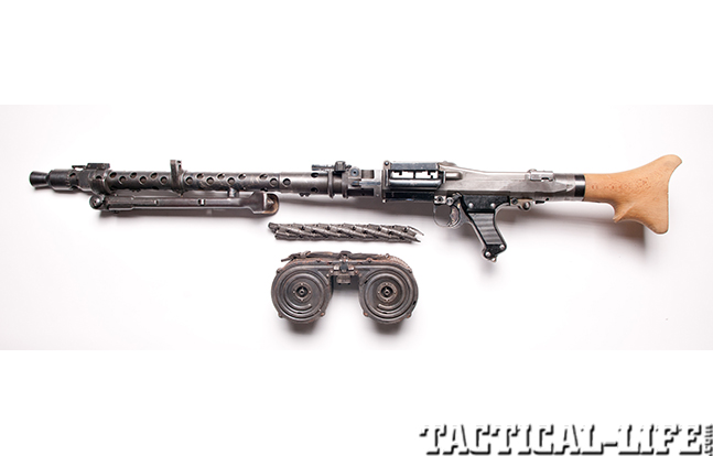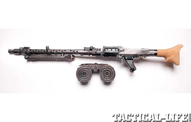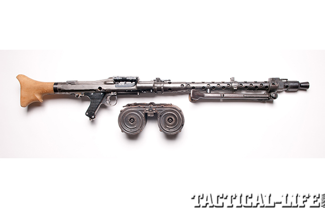 The German MG34 is an air-cooled, recoil-operated machine gun that could be used with different-length belts of non-disintegrating metal-linked ammunition, a metal basket drum that contained a 50-round belt of ammunition or a 75-round double drum magazine. The MG34 had a rate of fire of 800 to 900 rpm and an effective range of 2,000 meters. One of the most ingenious and useful design features of the MG34 was the ability to change barrels in the field without the need to bring the weapon to an armorer.