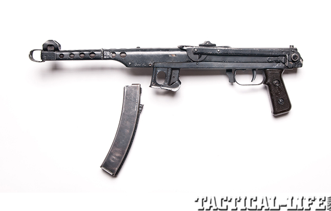 The PPSh41 was chambered in 7.62x25mm, which was the standard 86-grain bottleneck cartridge used in the famous Russian Tokarev pistol. The PPSh41 had a rate of fire of 900 rpm and was known to be incredibly reliable. Despite being issued in mass to Russian troops, numerous captured PPSh41s were also used by the German military. The Germans also converted a number of captured PPSh41s to operate with 9mm caliber ammunition. This conversion was known as the MP717.