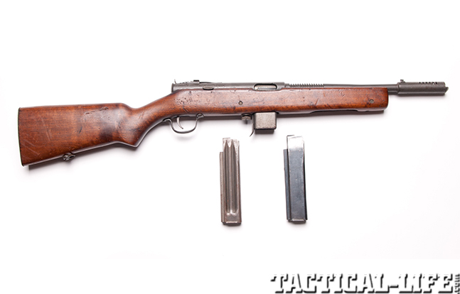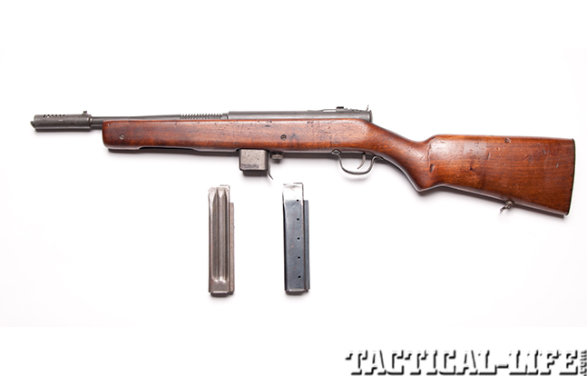 During the early days of WWII, the U.S. Marine Corps adopted the Reising M50 and M55 .45 ACP submachine gun because there was a shortage of standard-issue Thompson submachine guns. The Reising operated from a closed bolt and used a delayed-blowback operating system that was manufactured using a number of machined parts.