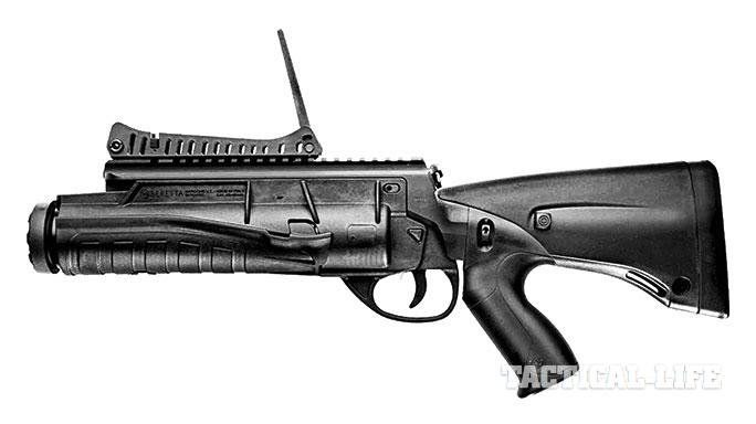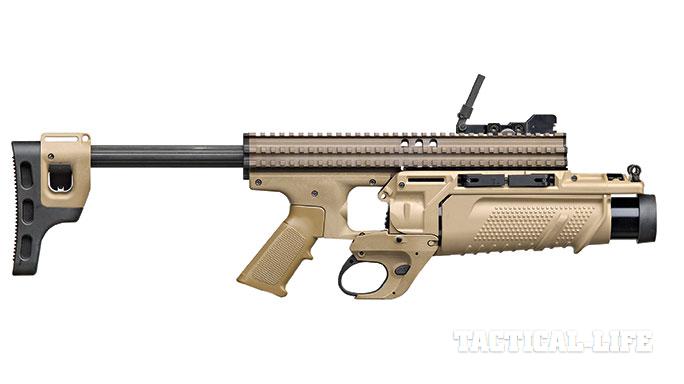 GLX 160 A1: Marketed by Beretta Defense Technologies, the GLX 160 A1 single-shot grenade launcher can be mounted to the ARX160 family of rifles or used as a standalone unit. The single-shot launcher is fully ambidextrous, weighs only 2.2 pounds, fires 40x46mm ammunition, and is made from aluminum and high-resistance polymer. The result is a powerful yet lightweight grenade launcher. The barrel assembly slides forward for loading. For more information, visit berettadefensetechnologies.com.