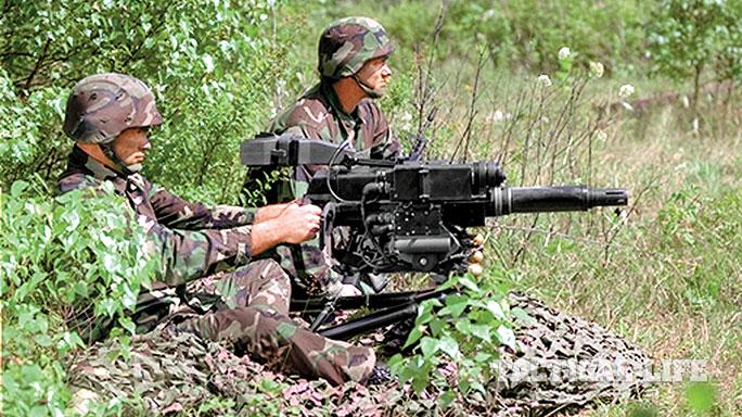 AGS-30: Another weapon designed to answer unconventional warfare threats, the Russian fully automatic AGS-30, adopted by the Russian Federation in 2002, fires 30mm GPD-30 grenades in 30-round linked belts. Its fully loaded weight is just over 66 pounds, so it can be carried by one operator. Firing is controlled by a trigger built into the weapon’s tripod, although the AGS-30 is more likely to be mounted on vehicles. The Russian AGS-30 can fire up to 400 rounds per minute, and it has a maximum effective range up to 2,500 yards. For more information, visit kpbtula.ru/en.