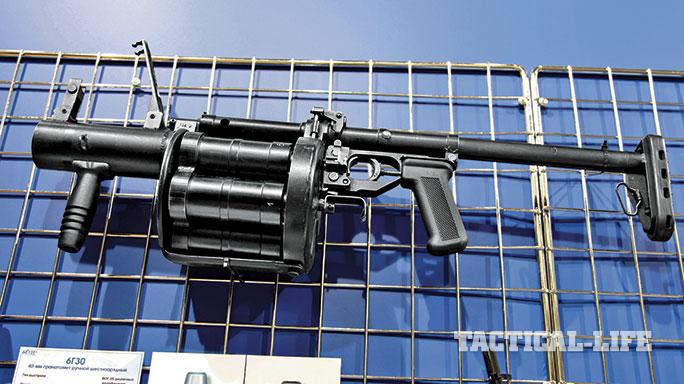 RG-6: The Russian RG-6, introduced in the 1990s, was designed to increase infantry firepower in urban combat environments. It is a six-shot system utilizing a large, spring-loaded, revolver-like cylinder that fires the same “caseless” 40mm rounds utilized in the GP single-shot launcher series. The double-action trigger mechanism permits two shots per second, a formidable rate of fire. The RG-6 design derives from the South African Milkor MGL, and it saw extensive use in the First and Second Chechen Wars. For more information, visit kpbtula.ru/en.