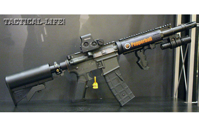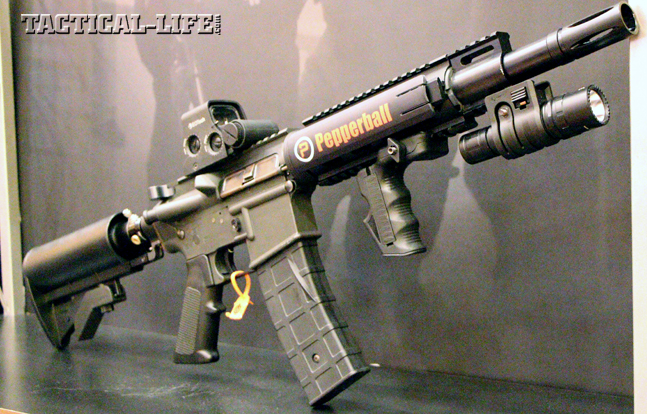PepperBall has introduced the P15 launcher for 2014. The new launcher looks and operates in a similar manner to the AR-15 rifle. It is magazine fed (20 rounds), but can also accept a standard hopper. When used with a hopper and magazine, the user can select between the two to deploy different projectiles.