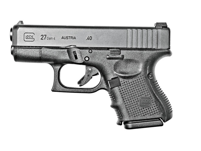 Introduced in 1995 as a companion model to the Glock 26 but chambered in the more powerful .40, the Glock 27 is otherwise identical. The Glock 27 is favored today by law enforcement, even though in .40 the magazine only holds nine rounds versus the Glock 26’s 10-round capacity. Now the GLOCK 27 Gen4 continues to rank among the most carried of all .40 subcompact handguns with an overall length of 6.41 inches, a height of 4.17 inches, a width of 1.18 inches and a weight of just 21.89 ounces unloaded.