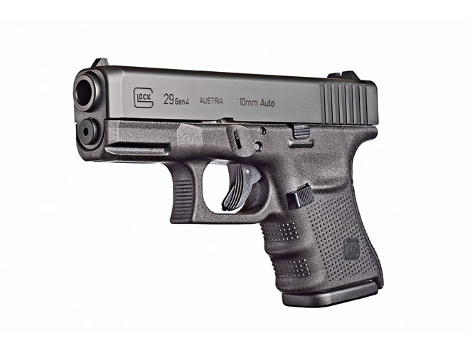 Introduced in 1996, this hard-hitting 10mm AUTO subcompact GLOCK rounded out a very popular trio of law enforcement calibers. Although the 10mm AUTO is not as commonly used today as it was in the late 1990s, the latest Gen4 version of the Glock 29 remains an all-around carry gun with the added advantage of an accessory rail, a comparatively short 6.88-inch overall length, a moderate height of 4.44 inches, a width of 1.27 inches and an unloaded weight of 26.83 ounces. The GLOCK 29 Gen4 also has a 10+1 capacity.